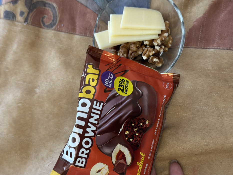 The image depicts a snack arranged on a surface in an indoor setting within the city of Perm, Russia. The primary subject is a Bombbar Brownie protein bar, presented in its red foil packaging. The packaging prominently displays the brand "Bombbar BROWNIE," indicates "Hazelnut" flavor, states "NO added SUGAR," and highlights "23% PROTEIN" with a 50g weight label. An illustration of a chocolate-covered brownie with a bite taken out, revealing a speckled red-brown interior and a hazelnut, is central on the package. To the right of the protein bar, a small, clear glass bowl contains approximately fifteen whole or halved walnuts and five uniform, rectangular slices of light yellow cheese, standing upright. A human left thumb is partially visible in the lower-left corner, positioned against the protein bar package. The items rest on a light brown, textured fabric surface, with a portion of a patterned fabric in shades of brown, blue, and red visible on the right side of the frame.