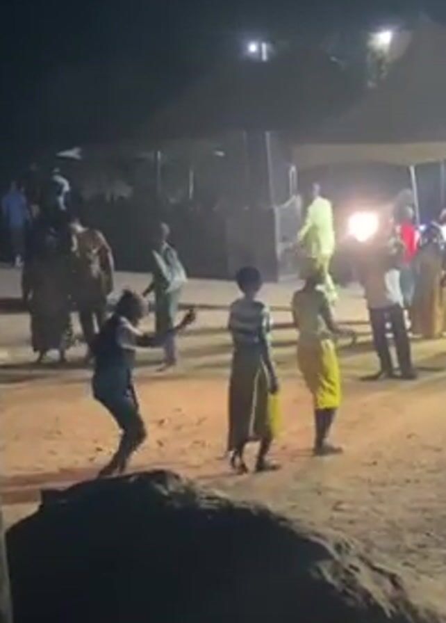 nighttime outdoor gathering, possibly a religious celebration, with several people dancing in a sandy area. A person in a bright green suit is on a slightly raised platform, possibly a stage, addressing the crowd. Behind the platform, there are white tents and people seated at tables. The lighting is provided by artificial sources, and the atmosphere seems lively. There are children dancing in the foreground, and a group of adults watching the event. The video is shot from the side, with a large rock or mound partially obstructing the view.