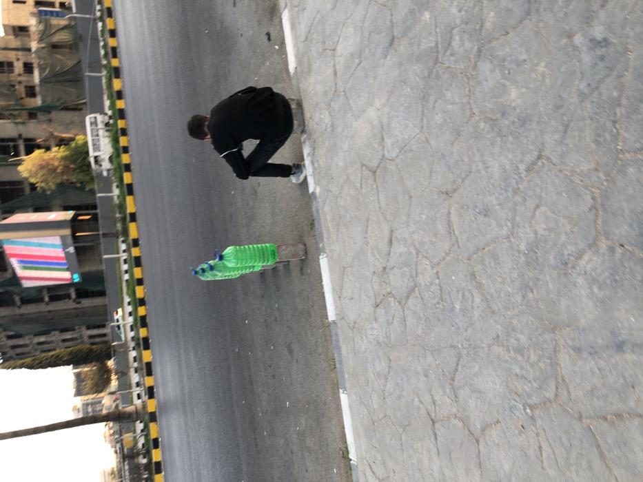 The image depicts an outdoor street scene within Al-Mazza Municipality, Syria. In the immediate foreground, a grey paved sidewalk with an irregular polygonal pattern is visible, bordered by a white concrete curb. Beyond the curb, on the edge of an asphalt road, a person is seated with their back to the camera, facing right. This individual wears a dark long-sleeved top, possibly with a white stripe on the upper arm, dark trousers, and light-colored shoes, sitting on a low, light-toned block. To the left of the seated person, four translucent green plastic bottles, each approximately 2-liter capacity and appearing filled, are positioned in a line on individual short, rough concrete blocks or bases along the roadside. The asphalt road, which is dark grey, extends into the background. Further across the road, a barrier featuring alternating yellow and black segments runs parallel. In the background, several multi-story buildings, some appearing to be under construction with visible scaffolding or netting, are present. A large digital screen or billboard prominently displays vertical colored bars in red, pink, blue, green, and white. Sparse trees with some reddish foliage are also visible, and a white van and a distant white car are present on a road or lot behind the barrier. The overall lighting suggests either early morning or late afternoon conditions.