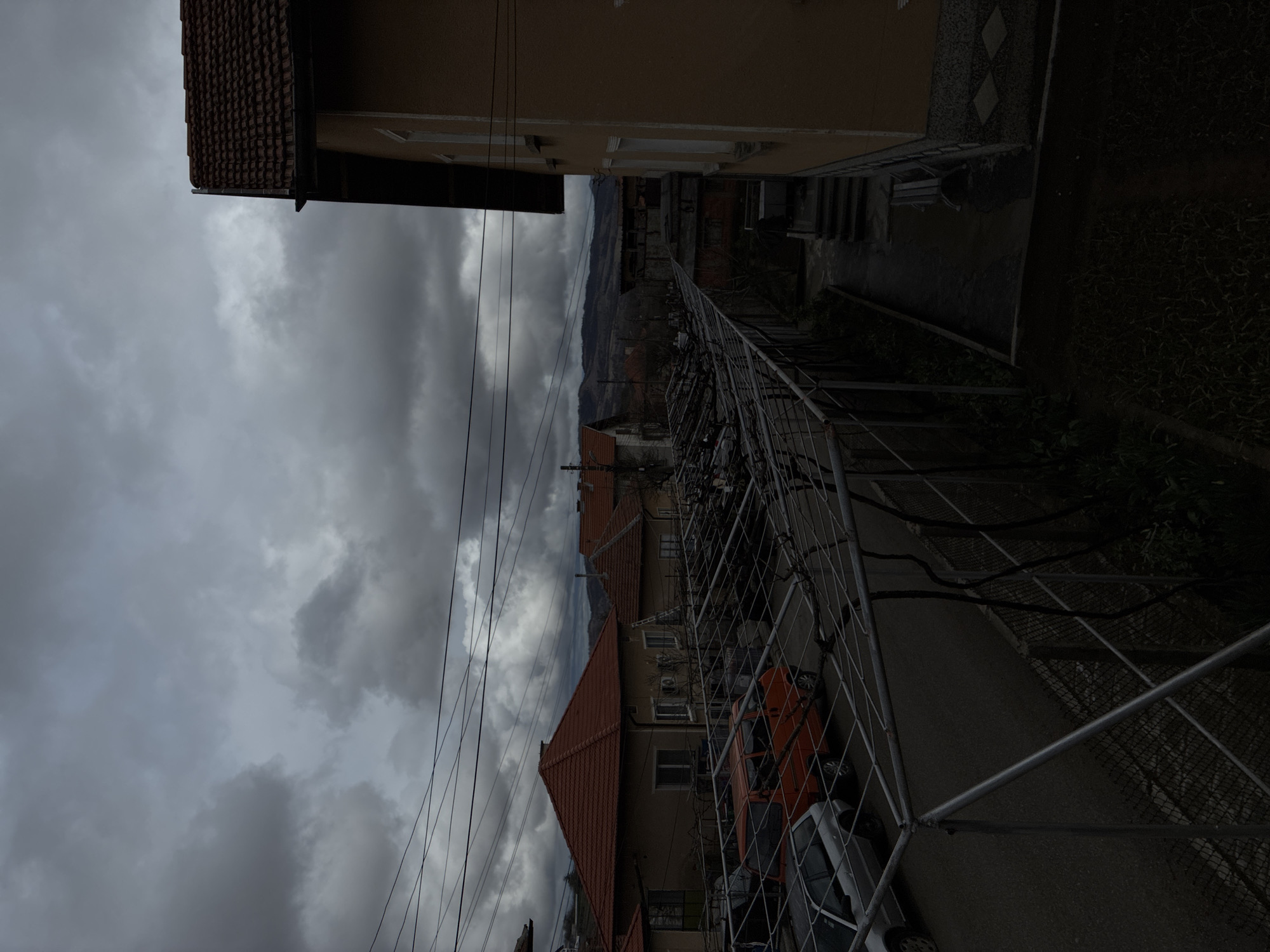 The image depicts a residential scene in Spanchevtsi, Bulgaria, viewed from an elevated perspective under a heavily overcast sky. In the immediate foreground, to the right, a section of a light brown building with a dark brown tiled roof is visible. The building features white-framed windows. Below this building, a dark, wet-looking paved path leads to a set of concrete steps, alongside which a dark wooden bench is situated. The base of the building exhibits a patterned granite-like finish. Extending from the lower left towards the mid-right is a metal trellis structure, composed of grey poles and a grid of wires or bars, presumably for vegetation, currently bare. Below the trellis, a dark asphalt road is visible. Parked on the left side of this road are two vehicles: a silver station wagon and an orange minivan. In the midground, several residential houses are present. A prominent, light-colored house with a distinct dark orange pyramidal tiled roof, multiple white-framed windows, and an external air conditioning unit is situated on the left. Further back and to its right, another house with a brown tiled roof has a long metal ladder leaning against its facade. Multiple black utility wires crisscross the upper midground. The background features distant, dark, undulating hills or low mountains that form the horizon. The entire sky is dominated by thick, dark grey clouds, indicating heavy overcast conditions. No people or animals are visible, and no overt actions or interactions are depicted. The environment is static and appears to be a quiet residential area.