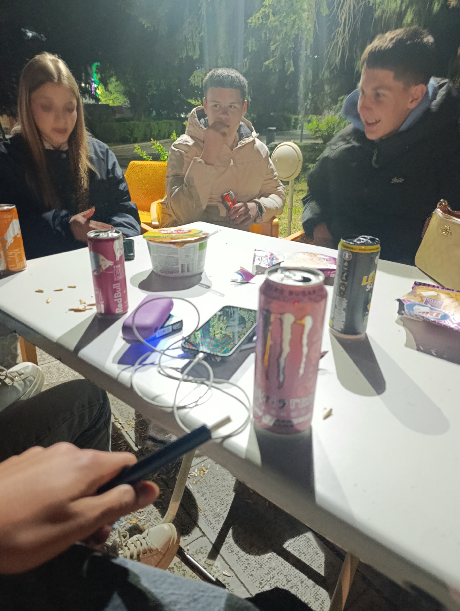 four individuals sitting around a white table outdoors at night. On the table are various items, including multiple cans of energy drinks (Red Bull, Monster), a cup of noodles, a mobile phone, what appears to be an electronic cigarette or vaping device, a lighter, and some loose bits of food. The three people fully visible are all young, one woman on the left wearing a dark jacket, one man in the center wearing a light-colored jacket, and one man on the right wearing a dark jacket. A hand holding a vaping device is visible in the bottom left corner. Yellow plastic chairs are seen in the background. The location is likely outdoors in the city of Silistra, Bulgaria, due to the visible vegetation. The individuals appear to be socializing.
