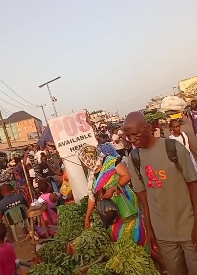 The video depicts a crowded outdoor market scene. People of various ages and genders are visible, many dressed in colorful clothing. They are engaged in shopping and interacting with vendors. Stalls and tables are laden with produce, including leafy greens, vegetables, and other goods. A sign indicating "POS AVAILABLE HERE" is visible, suggesting electronic payment options. The background includes buildings, utility poles with wires, and a partly cloudy sky. The environment appears bustling and busy with market activity.