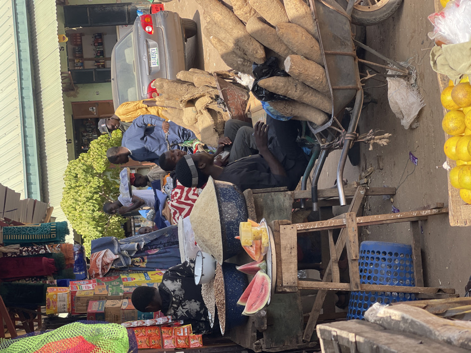 This image captures a vibrant, sunlit outdoor market scene in Samaru, Nigeria