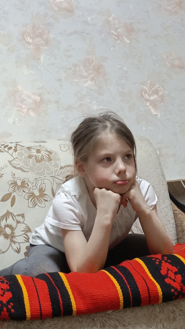 - "The scene, set indoors in the city of Sarapul, Russia, features a young female subject, identified as a child, seated on a beige sofa with a repeating light brown and dark brown floral pattern" by FM-F2yRz1, licensed under CC BY 4.0