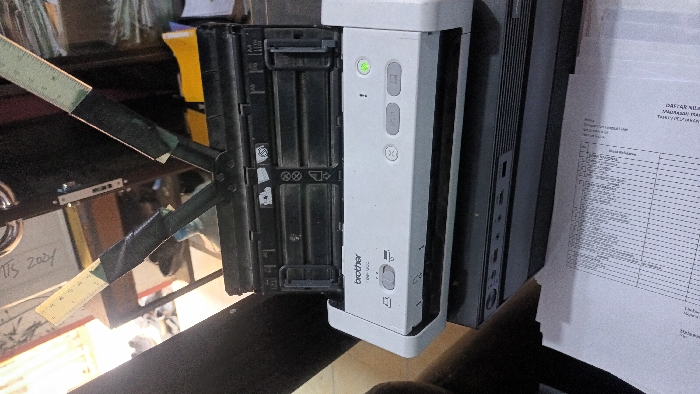 A printer, likely a Brother model, is shown with an open paper tray. The control panel features a lit green power button and other control symbols. A stack of papers is next to the printer. In the background, there appears to be some shelving and other items, and some structural supports wrapped in black tape are visible.