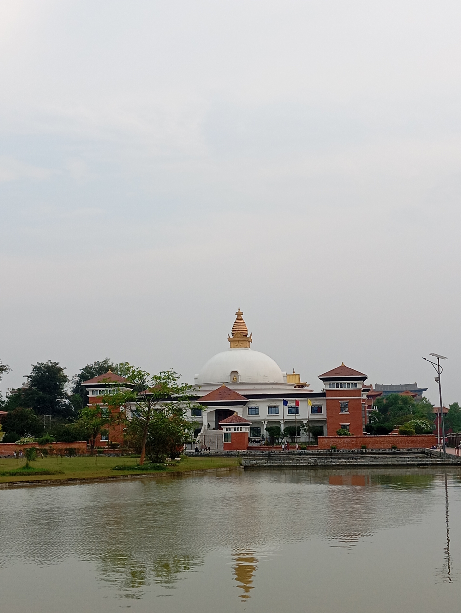 The scene captures a wide view of the Great Stupa and its surrounding structures within Lumbini Sanskritik, Nepal, under a uniformly overcast, light gray sky. A large, pristine white hemispherical stupa, topped with a golden, multi-tiered spire featuring a distinct finial, dominates the midground. This central edifice is integrated into a multi-story building complex with white lower sections displaying rectangular windows and several national flags (red, blue, yellow) on poles. The upper portions of the surrounding buildings feature red-brick construction, including prominent square towers with dark window bands and brown-tiled roofs. A smaller, ornate structure is partially visible to the far left, and another building with a traditional dark tiled roof is seen on the far right, partially obscured by dense green trees. In the immediate foreground, a calm body of water exhibits subtle ripples, reflecting the sky and the distant architecture. A strip of manicured green lawn, bordered by a low brick wall, separates the water from the main complex. Sparse, indistinct human figures are visible near the building's base and on the lawn. A tall, dark streetlamp equipped with a solar panel stands on the far right.