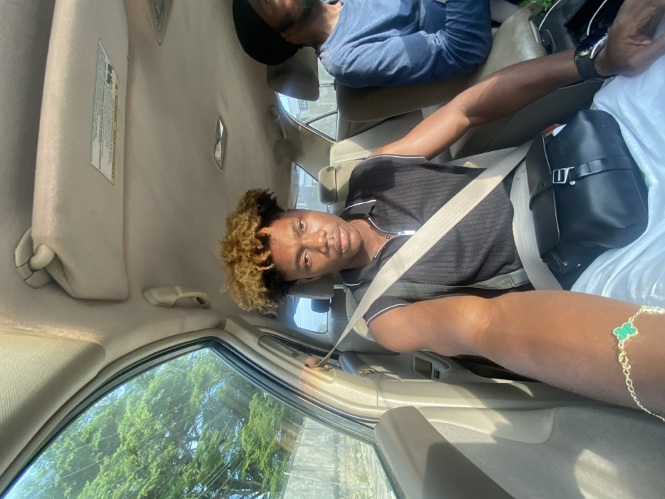 Inside a light beige vehicle, two male occupants are present during daylight hours in Igboefon, Nigeria. The primary subject, a male with dark skin, occupies the front passenger seat. He has bleached blonde curly hair with dark roots, styled upwards, and wears a black sleeveless polo shirt with white trim and a zipper. A seatbelt is fastened across his chest and lap. On his left wrist, a gold-colored bracelet with three green clover-shaped charms is visible, while a dark watch with a metallic face is on his right wrist. A black leather-like bag with a buckle closure rests on his lap. His right arm is extended, holding what appears to be a camera, as he looks directly at the lens with a neutral expression. To his right, a second male occupant, partially visible, is seated. He has dark skin, wears a blue long-sleeved shirt, and a black knit cap or durag. He is oriented forward, away from the camera. Through the front passenger window, lush green foliage from trees and a grey concrete wall are visible, indicating an outdoor setting. The car's interior features a beige headliner, sun visors, and seat upholstery.