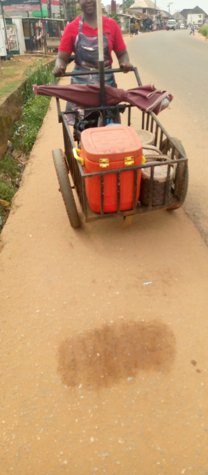 An overhead-angle shot depicts a woman pushing a metal cart along an unpaved, light brown-orange road in Nsugbe, Nigeria. The woman, positioned centrally, wears a red shirt and a dark apron, and is smiling faintly. Her hands grip the cart's handlebars. Attached to the cart's upper frame is a folded maroon umbrella. The cart itself is a four-wheeled structure carrying an orange cooler with yellow handles and metallic clasps, along with at least two cylindrical woven baskets. To the left of the cart is a narrow dirt shoulder and a shallow drainage ditch containing green vegetation. The road surface in the immediate foreground exhibits a dark, irregularly shaped stain. In the background, a paved road stretches into the distance, populated by a white van, other vehicles, pedestrians, and various commercial or residential buildings under an overcast sky.