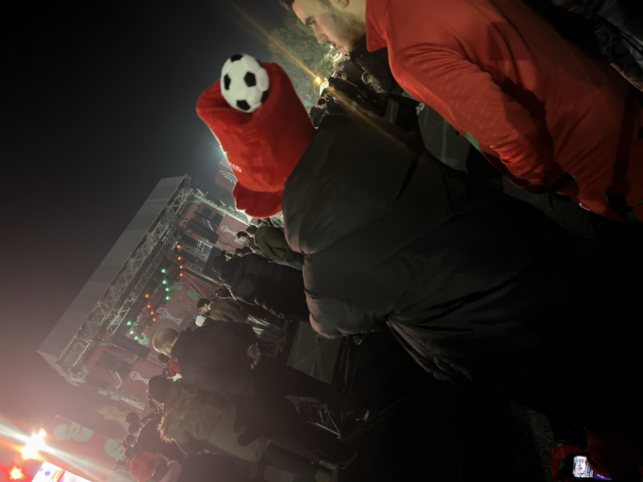 A night scene features a crowd gathered for a performance or event. A large stage with lighting rigs and branding is visible. In the foreground, a person wears a red hat with a soccer ball perched on top. Another individual in a red shirt stands nearby. The crowd seems densely packed, illuminated by stage lights and phone screens. The overall atmosphere is festive, with a focus on the event taking place on stage.