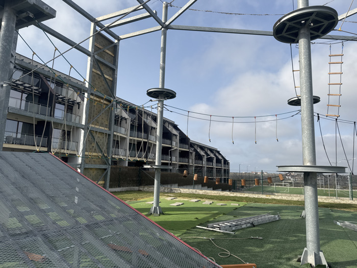 The image captures an outdoor adventure park scene in Topola, Bulgaria. In the immediate foreground to the left, a large inclined structure with a dark grey expanded metal mesh surface is present, featuring a red trim along its lower edge. The midground is dominated by multiple tall, galvanized metal poles, each topped with circular platforms at varying heights. An aerial obstacle course is constructed between these poles, consisting of ropes looped to form stirrups, ropes with suspended wooden cylindrical obstacles, and wooden ladder sections. The ground beneath the adventure park components is covered with artificial green turf. Several metallic structures, including a long ladder segment, lie horizontally on the turf. To the left, a multi-story building with numerous balconies, dark railings, and large windows is visible behind sections of the adventure course. In the background, beyond a low hedge, a large green field, possibly a sports pitch, is visible through a fence. The sky is partly cloudy. No individuals are present in the depicted scene.
