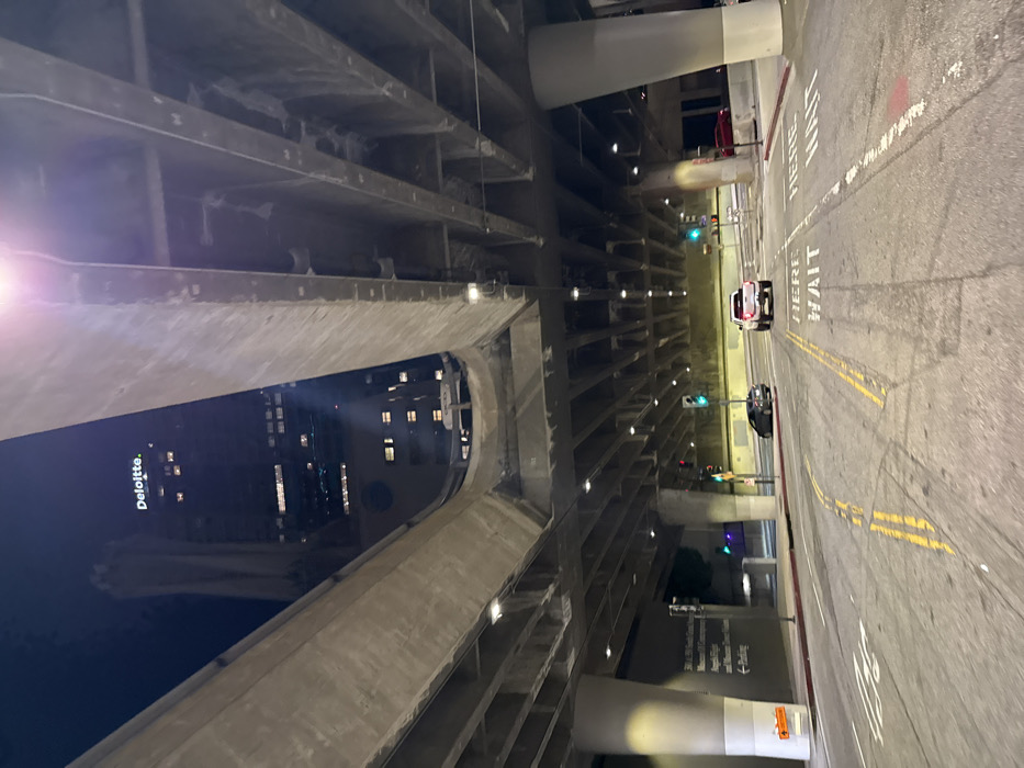 This image depicts a nighttime urban street scene in Downtown Los Angeles, California, United States. The perspective is from ground level, looking forward under a massive, multi-tiered concrete freeway overpass, likely the US-101 (Hollywood Freeway) intersecting South Grand Avenue. The upper half of the image is dominated by the complex underside of the concrete freeway structure, featuring numerous beams, girders, and support pillars. Recessed lighting fixtures are visible on the underside of the overpass. Through a large gap in the elevated structure, a tall, dark skyscraper is visible against the night sky, with "Deloitte." illuminated in white at its peak. Several windows of this building and other background structures display interior lighting. The lower half of the image shows an asphalt roadway with multiple lanes, marked with double yellow lines, white dashed lines, white stop lines, and the words "HERE WAIT" painted in white in several lanes. Three vehicles are present: a light-colored pickup truck is in the right lane, positioned away from the viewer; a dark-colored sedan is in the left lane further back, also oriented away from the viewer; and a red vehicle is partially visible on the far right. All vehicles appear to be stationary or moving slowly. On the left side of the road, a dark street sign affixed to a concrete support pillar reads "300 S. Grand Ave. Museum of Contemporary Art Angela Burger and Maurice Cantor Pavilions <- Parking". Two sets of vertical traffic lights on poles on the left display green signals. On the right, another set of vertical traffic lights displays red and yellow signals. An orange construction barrier or cone is visible on the far left curb. The scene is illuminated by artificial streetlights, building lights, and vehicle lights, with a noticeable lens flare in the upper right quadrant of the image. No individuals are visible.