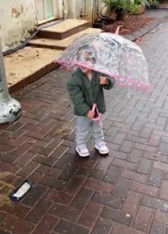 A little girl in a green jacket and grey pants stands on a wet brick walkway holding a clear umbrella with pink trim