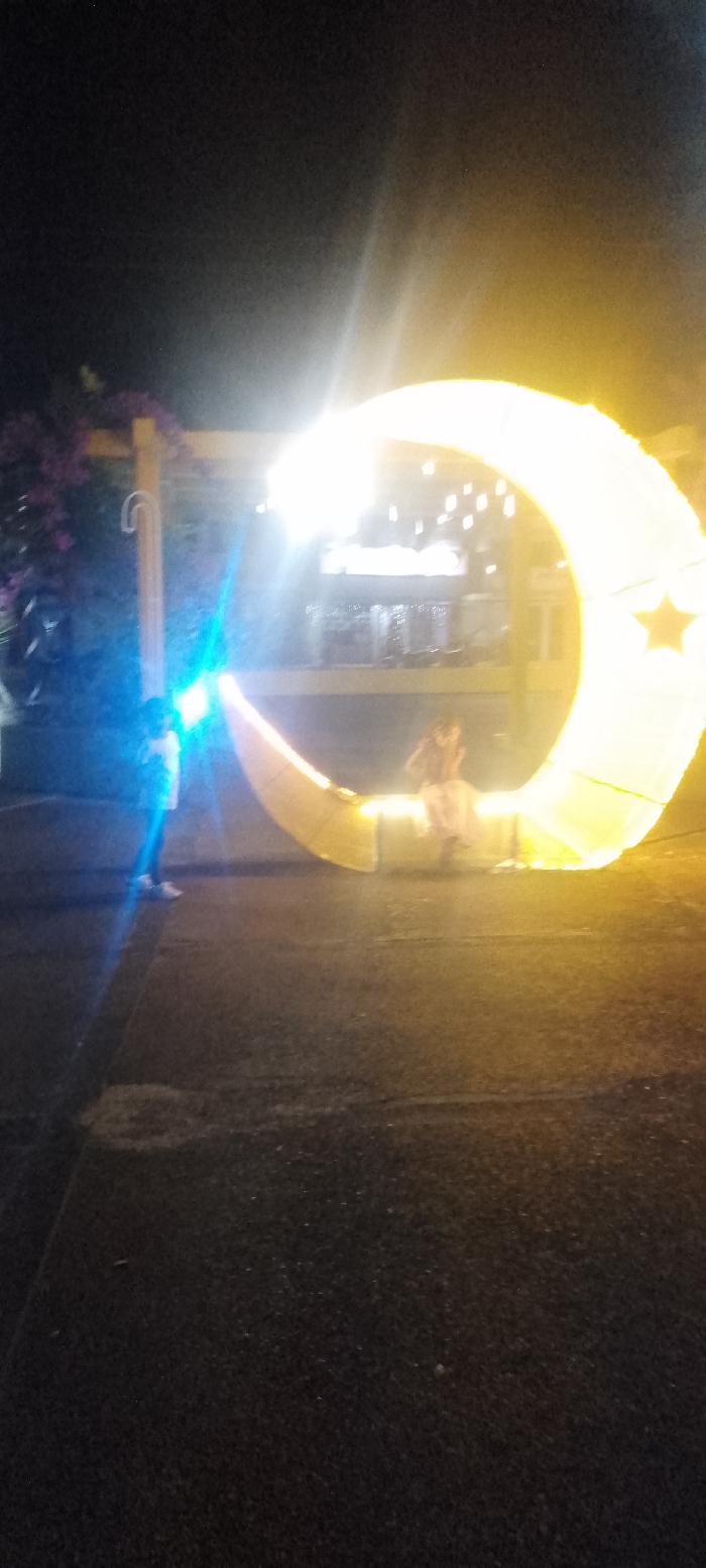 The image displays a nighttime scene in the city of La Fría, Venezuela. In the foreground, a dark, paved surface occupies the lower half of the frame. The central subject is a large, illuminated crescent moon structure, glowing brightly with a warm yellow-white light, and featuring a distinct star shape on its upper right curve. A person is seated on the lower interior edge of this moon structure. To the left, another individual stands, largely obscured by an intense blue light source originating near them. In the mid-ground, behind the illuminated moon, structural elements of what appears to be a building or market stall are visible, adorned with multiple small lights. To the upper left, a wooden archway with an overhead crossbeam is present, with purple flowering foliage behind it. The overall environment is dark, illuminated by the prominent artificial lights of the moon structure and the blue light source.