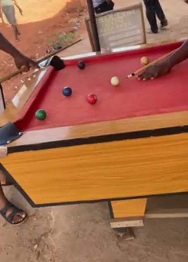 two men playing a game of pool outdoors on a small pool table. The table has a light wood grain exterior and a red felt surface. There are multiple colored balls on the table, including red, blue, green, black, and white cue balls. One of the men is holding a cue stick and preparing to take a shot. The other man is standing next to the table, pointing with his finger. In the background, there are other people, a sign, and a dirt road. The environment seems to be a sunny, casual outdoor setting.