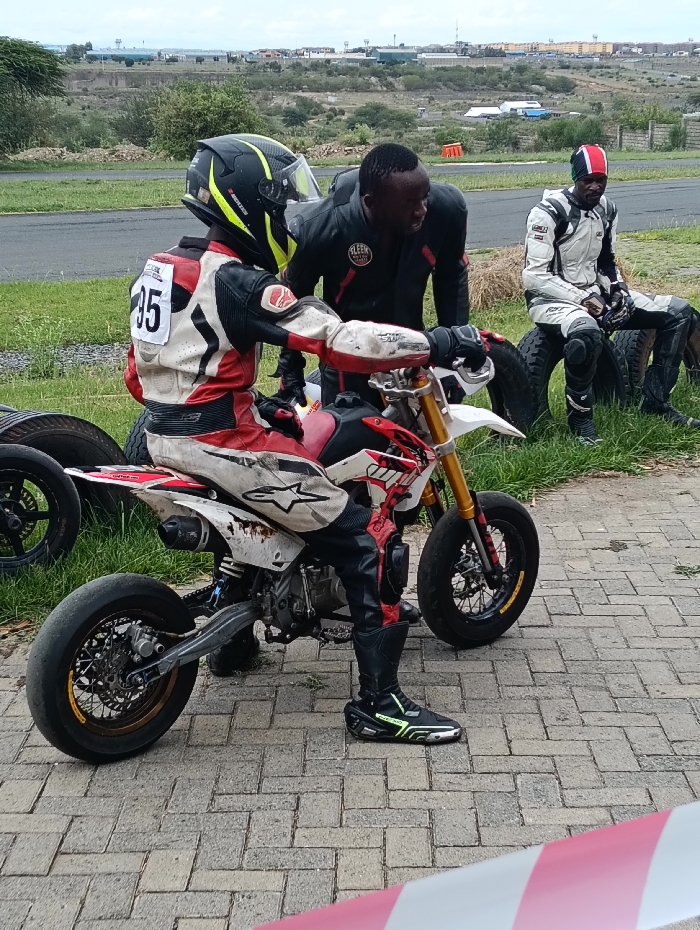 Three men are near a racetrack. One is sitting on a small motorcycle, wearing a red, white, and black suit with the number "95" on the back and a black and yellow helmet. Another man in a black racing suit leans over the motorcycle. The third man sits on a stack of tires, wearing a white and red racing suit and a red and white head covering. Tires are scattered nearby, and a building is visible in the background.