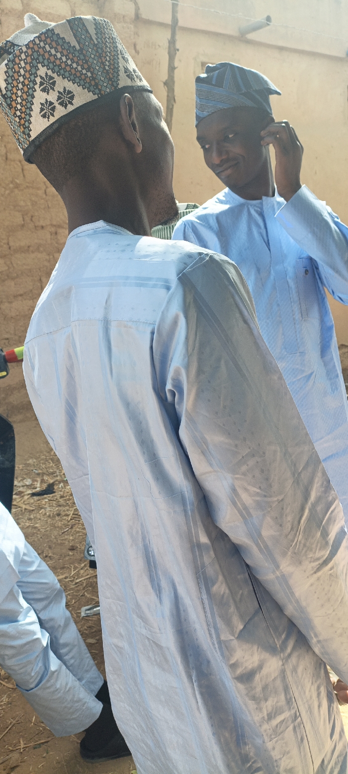 The scene, located in Ungogo, Nigeria, features three male individuals outdoors. The primary subject in the foreground is observed from the rear-right profile, wearing a light blue, long-sleeved traditional garment with subtle vertical stripes and dot patterns, and a beige cap adorned with blue, orange, and black geometric embroidery. To his right and slightly behind, a second male subject is visible from the chest up, facing forward with his head slightly turned left, displaying a smile. He wears a similar light blue garment and a dark blue cap with light blue horizontal stripes, which he is adjusting with his right hand near his ear. In the bottom-left corner, the lower legs and feet of a third individual are visible, clad in light blue trousers and black shoes, positioned on dry, reddish-brown earth. The background consists of a light brown, textured wall, likely constructed from mud or unpainted brick. The environment is under direct natural sunlight, creating distinct shadows.