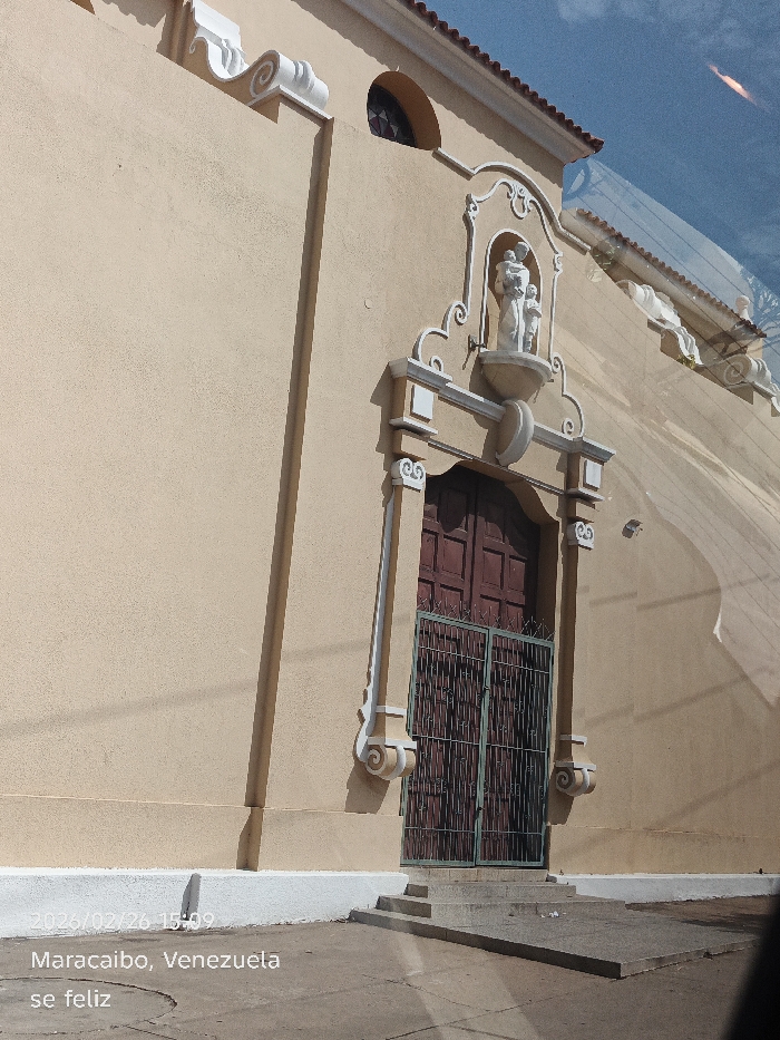 The image presents the exterior of a light beige-tan building, identified as being in Maracaibo, Venezuela, as indicated by overlaid text. The scene is captured under bright daylight conditions, evident from the distinct shadows cast by architectural elements. The primary subject is the building's facade, centered around a main entrance. This entrance features dark reddish-brown double doors, secured by a closed green metal grille gate. Three shallow, light-colored concrete steps lead from a paved foreground directly to the entrance. The doorway is framed by elaborate white decorative elements, including pilasters with scrolled bases and capitals supporting a sculpted archway. Above the doors, within a recessed niche, stands a white statue depicting two figures: a larger figure supporting or holding a smaller one. Further above this, a small arched window with dark, patterned glass is visible. To the left of the main entrance, the building's facade extends as a large, unadorned beige wall section, distinguished by a single vertical white decorative strip. The base of the entire structure is demarcated by a white plinth. The upper right portion of the image reveals a partial view of the building's roof, covered with reddish-brown terracotta tiles, set against a clear blue sky with minimal cloud cover. Reflections, consistent with an image taken through glass, are apparent in the upper right, showing indistinct linear and amorphous shapes, including an orange streak. No people are present or engaged in any discernible actions or interactions within the frame. A digital timestamp "2026/02/26 15:09" and the text "Maracaibo, Venezuela se feliz" are overlaid in white in the lower left corner of the image.