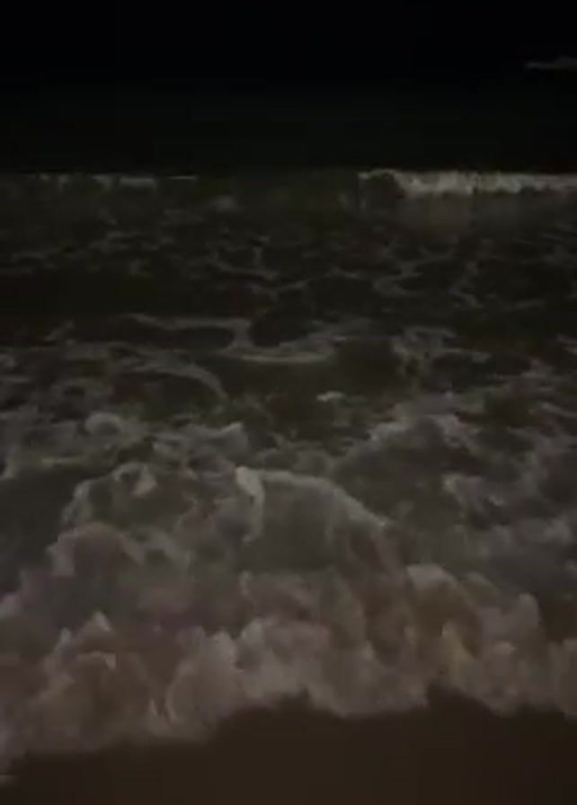 dark beach at night. Waves are lapping onto the sandy shore. The horizon is visible, but the darkness obscures any specific details beyond the water meeting the sky.