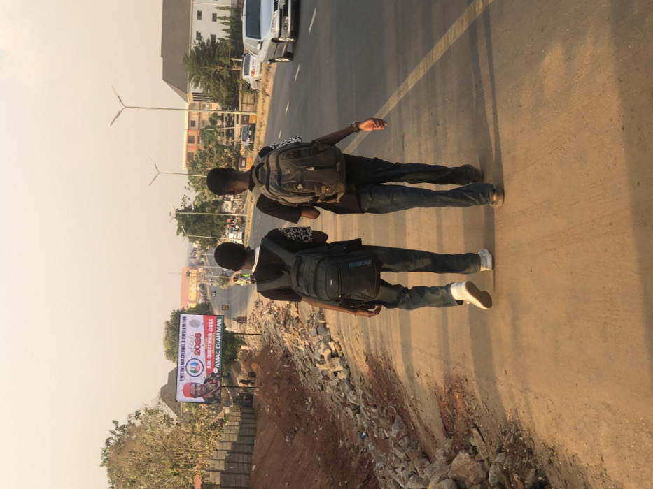 Two young men wearing backpacks walk along the roadside. One wears white sneakers, the other wears tan ones. A road separates them from a building. Cars are on the road in the distance. An election poster is visible on the side of the road. The sky is overcast. The road is wide, and the lighting indicates it is midday.