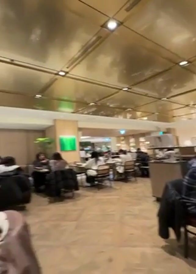 The camera pans around a well-lit, modern cafe or restaurant, showing several tables occupied by people