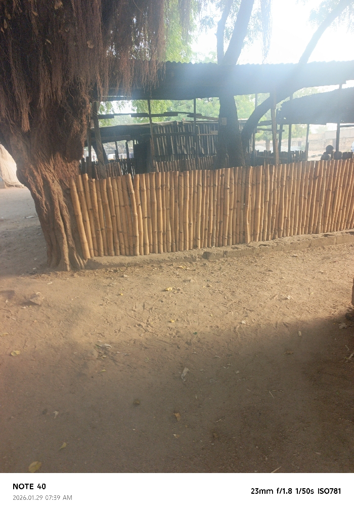 A tan bamboo fence borders an open-air structure with a corrugated roof supported by posts. A large tree with hanging roots sits to the left of the fence. The ground is dusty and tan. In the background, figures are seated inside the structure. Sunlight filters through the openings of the structure and illuminates the fence. The image is taken at ground level.