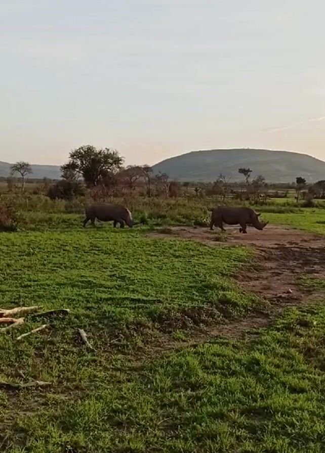 two rhinos in a field, with one rhino on the left grazing in the grass and the other rhino on the right walking along a dirt path. The field is green with some patches of dirt and is surrounded by trees and a distant hill under a partly cloudy sky.