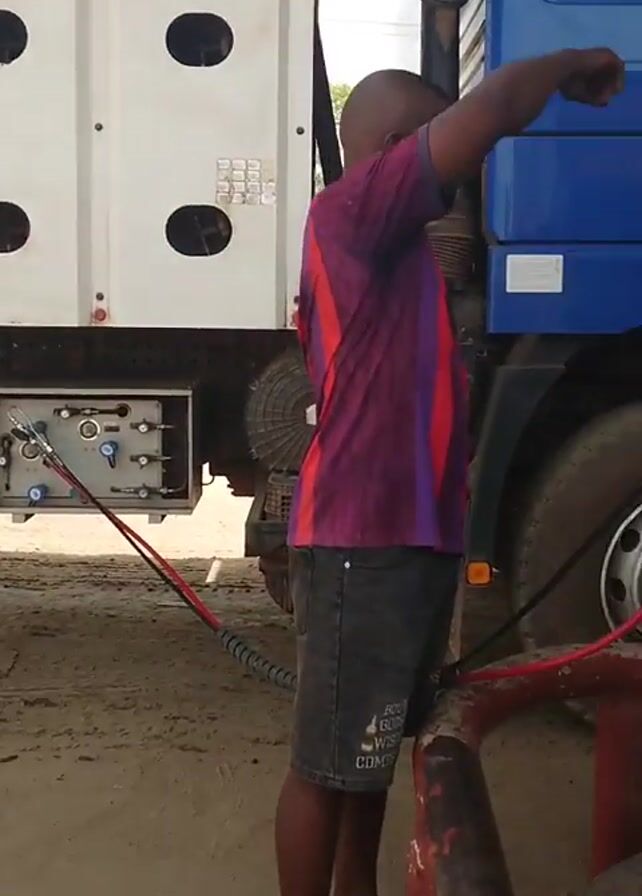 series of shots depicting people fueling a large truck with gas at what appears to be a gas station