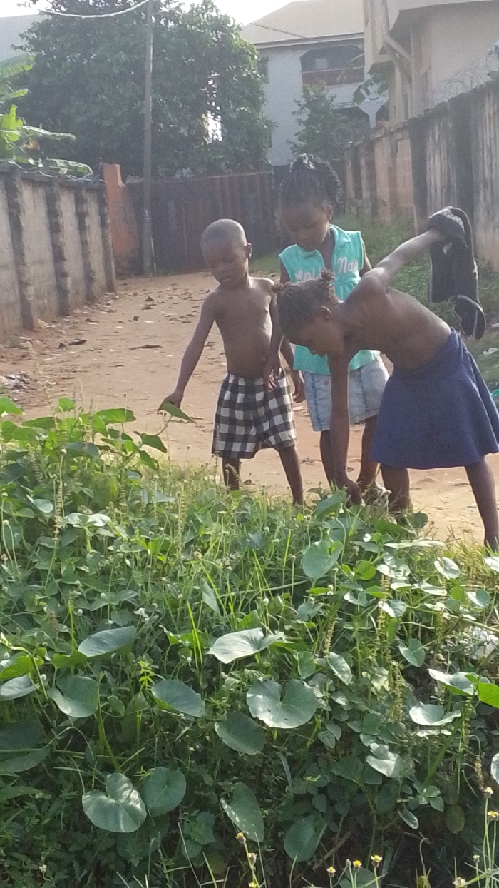 The scene depicts three young children engaged with dense vegetation along an unpaved path in Onitsha, Nigeria