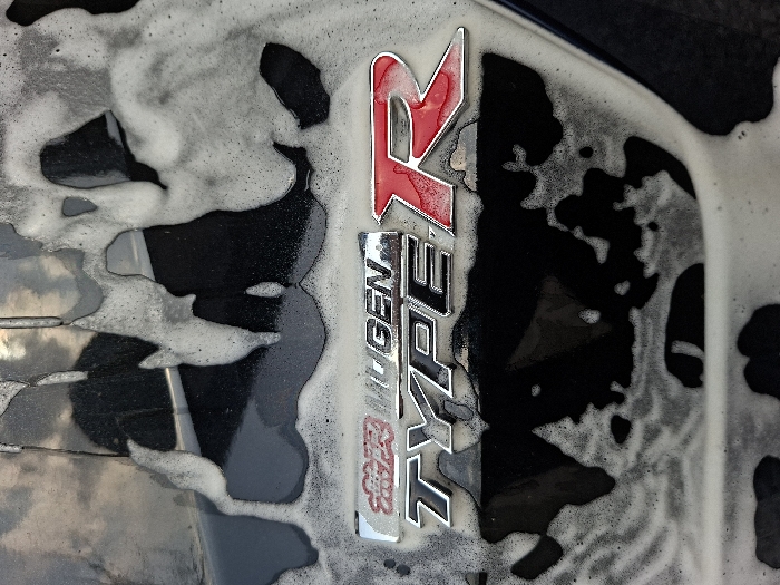 A close-up forensic depiction details a metallic "MUGEN TYPE R" vehicle emblem affixed to a dark automotive panel. The emblem features silver lettering for "MUGEN TYPE" and a prominent red "R," with black details and outlines. The emblem and the immediate surrounding dark vehicle surface are extensively covered in white, frothy soap suds, indicating an active vehicle washing process. The suds are irregularly distributed, exhibiting distinct drip patterns and concentrations. Reflections of an indistinct light source or sky are visible on the wet, dark paintwork and the metallic surfaces of the emblem. No individuals or other specific objects are visible within the frame. This scene is located in Skutare, Bulgaria.