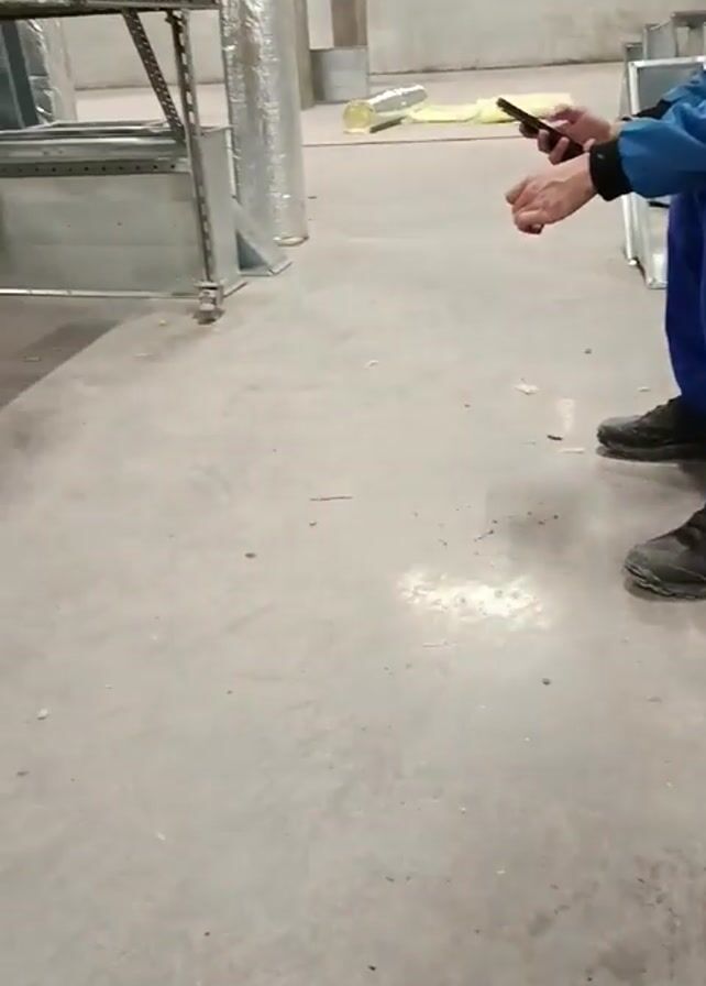 warehouse or factory floor. A man in a blue jacket and blue pants is sitting on a metal duct, looking at his phone. There are several other metal ducts and ductwork components scattered around the floor. Some of the ducts are covered in a shiny, insulated material. The floor is concrete and appears dusty. There's also a metal cart with ducts and boxes on it. The camera moves around a bit, showing the different components and the man sitting on the duct.