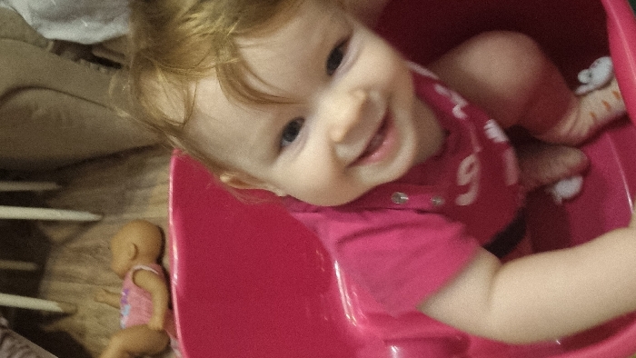 - "A baby girl with blonde hair is positioned inside a red, bucket-like container, wearing a pink shirt with the number "91" on it" by FM-MGDNO2, licensed under CC BY 4.0