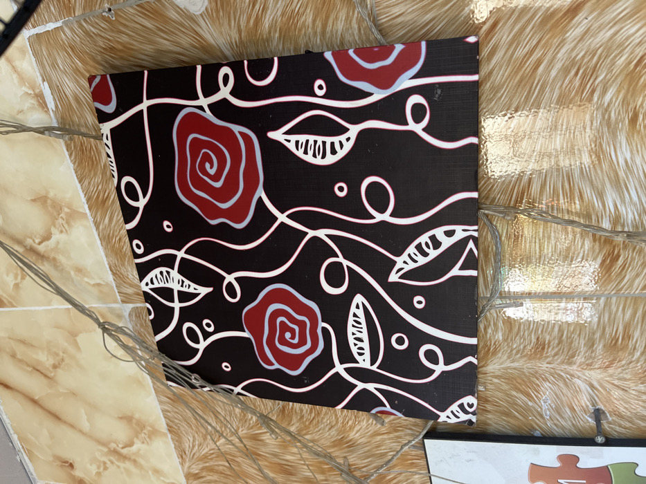 The scene is located in Kurudu, Nigeria. A rectangular canvas painting, approximately 60x70 cm, is vertically mounted on a tiled wall. The painting features a dark brown or black background adorned with a repetitive, stylized pattern of red roses with light blue outlines and white centers, interconnected by abstract white curvilinear lines and various white, elongated leaf-like shapes. The wall behind the painting is clad in two types of ceramic tiles: an upper section of light beige and brown mottled tiles, and a lower section of darker, reddish-brown tiles with an irregular, textured surface. A thin, multi-stranded, light-colored wire, consistent with decorative string lights, is draped across the upper left and lower right corners of the painting and the adjacent wall, partially obscuring both. A portion of another white-framed object, possibly a jigsaw puzzle or a picture, with a red and green design, is visible in the bottom left corner of the image, below the main painting. No individuals, actions, or direct interactions are depicted within the frame.