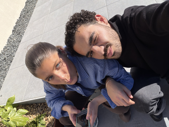 This image captures two individuals, an adult female and an adult male, in an outdoor setting in Marche-lez-Écaussinnes, Belgium. Both subjects are crouched or kneeling, positioned closely together and looking upwards towards the camera. The scene is brightly lit by direct sunlight. The female, positioned on the left side of the frame, has dark hair pulled back and blue eyes; she wears a blue and white checkered long-sleeved shirt and dark trousers. She holds a smartphone displaying an image on its screen in her left hand. Her right shoulder is partially covered by the male subject's head. The male, situated on the right, has dark, curly hair and a beard. He wears a black long-sleeved hooded top, dark grey pants, and black shoes. His head rests on the female's right shoulder, and his left hand, adorned with a thin bracelet, rests on her right arm. Both individuals have their lips slightly pursed, and the male's right eye is partially closed. The environment includes a light gray tiled surface covering most of the ground directly beneath the subjects. To the left, there is a border of dark grey gravel, and further left, an area of wood chip mulch with green foliage, including a plant with large, light green leaves, is visible in the lower-left corner.