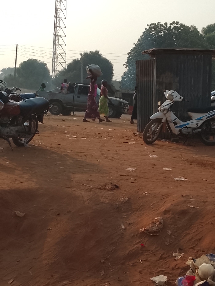 A dirt road scene features a couple walking with one carrying a load on her head, next to a pickup truck with people in the back. Motorcycles line one side of the road, and a corrugated metal structure stands on the other. A communication tower is visible in the background. Litter is scattered on the ground.