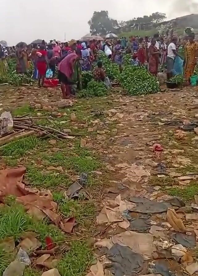 crowded outdoor market in an area strewn with litter