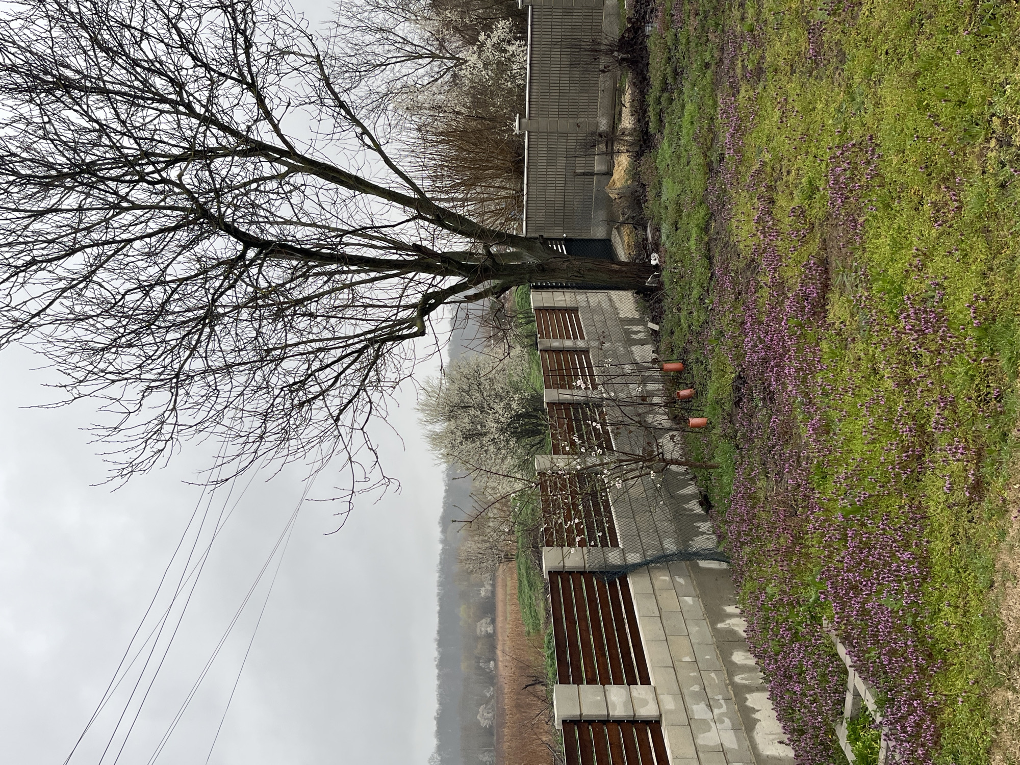 The image depicts a rural scene in Pchelnik, Bulgaria, characterized by overcast skies and early spring vegetation. A mature deciduous tree with bare branches dominates the left side of the frame, contrasting with a patch of green ground cover interspersed with purple wildflowers on the right. A concrete block fence with wooden slats runs diagonally across the middle of the image, separating the foreground from a distant view of trees and fields shrouded in mist. Power lines are visible in the upper left corner of the image, suggesting proximity to residential areas. The scene evokes a sense of tranquility and quiet.