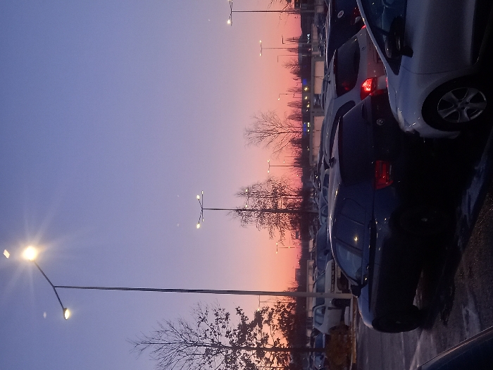 A parking lot scene during twilight. Silhouetted trees and lampposts punctuate a gradient sky transitioning from orange at the horizon to deep purple overhead. Parked cars, mostly dark-colored, fill the right side of the frame. Their taillights are faintly visible. The lamppost in the foreground is illuminated, casting a bright glow.