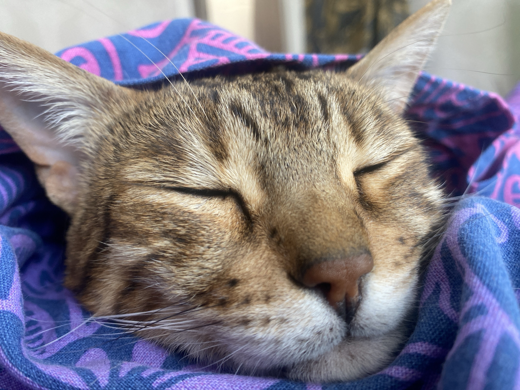 - "A close-up shot depicts a tabby cat sleeping soundly, partially wrapped in a blue and purple patterned cloth" by FM-2nUQI2, licensed under CC BY 4.0