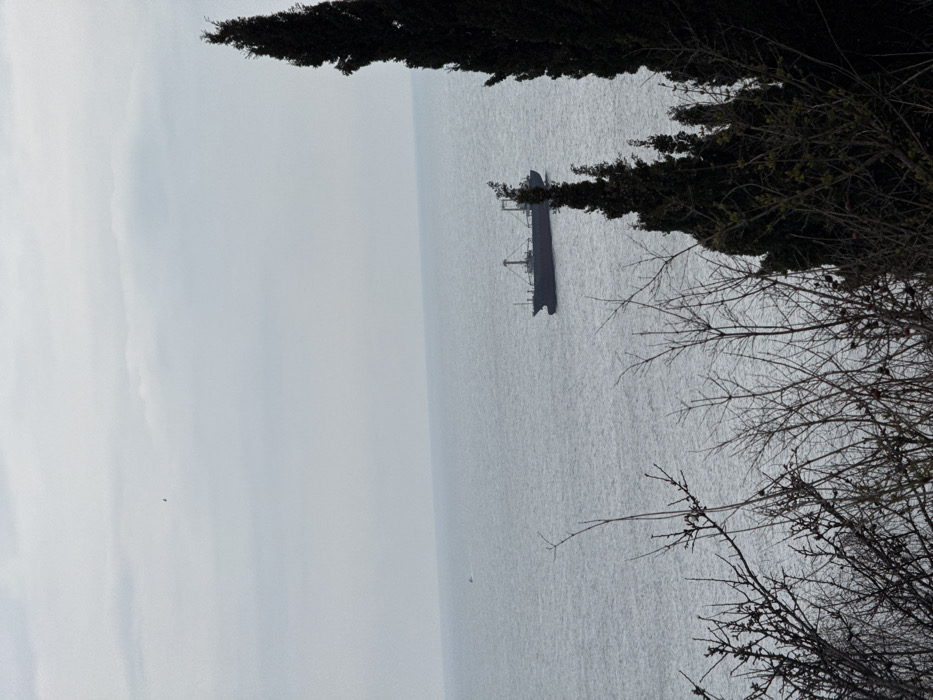 The image depicts an overcast seascape observed from an elevated vantage point in Varna, Bulgaria, overlooking the Black Sea. The sky is uniformly light grey and cloudy. A dark, small object, possibly a bird or drone, is visible in the upper central sky. The water surface is a calm, rippled grey-blue. In the mid-ground, a dark-hulled cargo vessel, approximately 150-200 meters long, is positioned to the right of center. It features a visible superstructure and at least two prominent cargo derricks or cranes. The ship appears to be either stationary or moving slowly. Further in the background, to the left of the cargo ship, a smaller, lighter-colored boat, possibly a speed boat or fishing vessel, is discernible in motion. The foreground is occupied by dense vegetation. Dark, mostly bare deciduous branches and shrubs form a layer across the bottom left and center. On the right side, several tall, dark green coniferous trees, appearing to be cypresses, extend upwards, partially framing and obscuring the view of the sea. No human figures are visible.