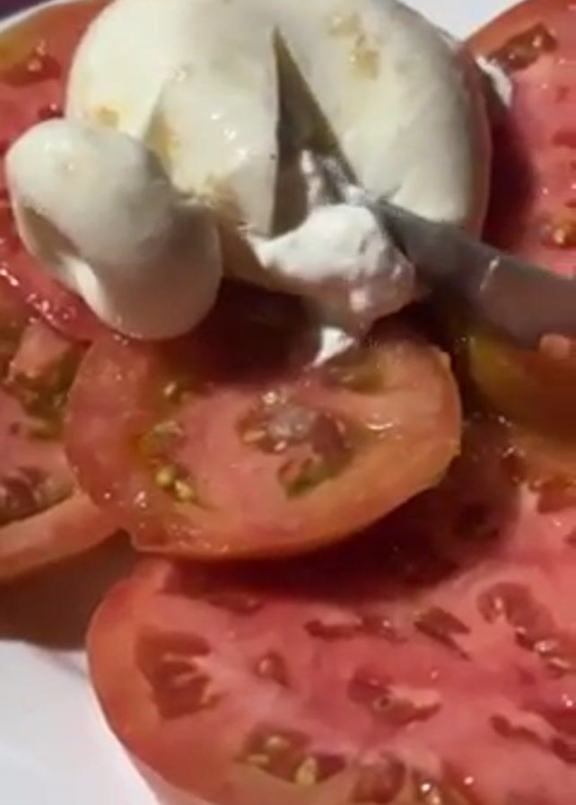 - "A close-up shot shows a plate of tomato and burrata salad being cut with a knife" by FM-l2qUu2, licensed under CC BY 4.0