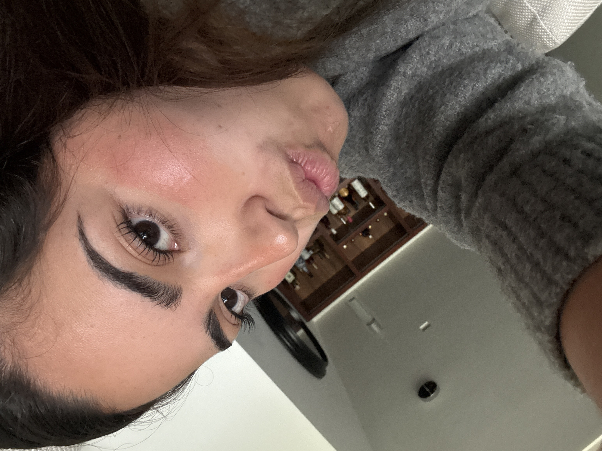 A woman with brown hair, fair skin, and dark eyebrows is looking at the camera with pursed lips. She is wearing a gray sweater. In the background, a dark wooden shelf with bottles and decorative items can be seen. The background also includes a white wall with a dark circular object, possibly a clock or mirror. The setting appears to be indoors. There is no evidence to place the scene within the city of San Bernardino Tlaxcalancingo, Mexico.
