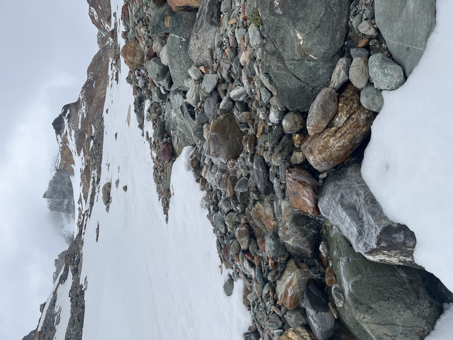 A mountain landscape scene displays a rocky slope transitioning into a snow-covered expanse. An assortment of rocks, varying in size and color, intermix with patches of snow. The rocks closer have a smoother, wet appearance, while the snow is pristine white. A distant, rugged peak emerges through the clouds.