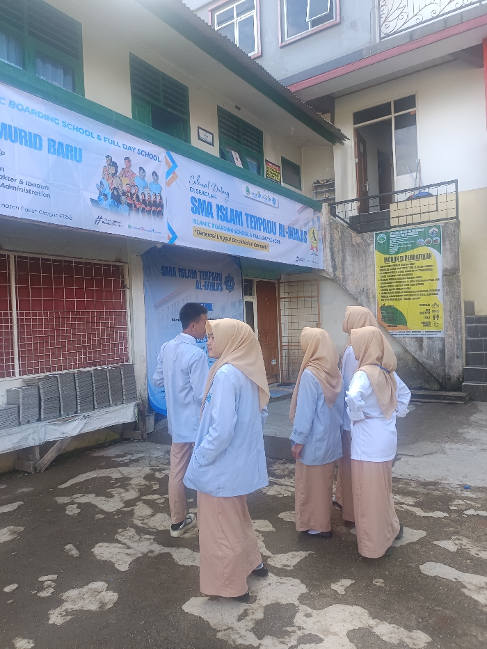 A group of students wearing similar light blue and brown uniforms stands outside a building. Banners hanging on the building promote "SMA ISLAM TERPADU AL-IKHLAS" and announce new student registration for an Islamic boarding school. The building has a simple, multi-level design with windows and stairs. One sign includes a request to pay attention and listed rules or guidelines.