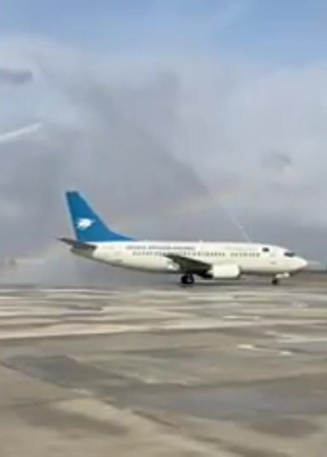 A Boeing 737 jet, identified as Ariana Afghan Airlines, receives a water salute on a wet airport tarmac