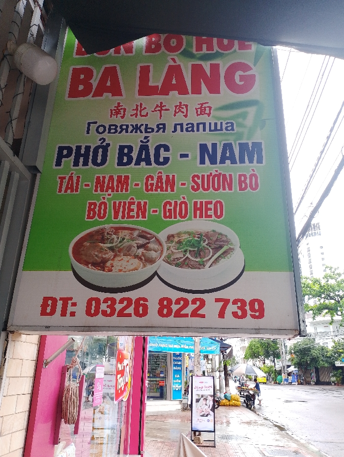 A street-level perspective captures a vibrant commercial sign in Nha Trang, Vietnam, displaying food offerings against an overcast sky. The primary subject is a large vertical banner sign, predominantly green with a white base, hanging from an awning. The sign advertises "BUN BO HUE BA LÀNG" in red, followed by "南北牛肉面" (Northern and Southern Beef Noodles) in Chinese, and "Говяжья лапша" (Beef noodles) in Russian. Below, "PHỞ BẮC - NAM" (Northern - Southern Pho) is in blue, with menu items "TÁI - NAM - GÂN - SƯỜN BÒ - BÒ VIÊN - GIÒ HEO" (Rare beef - Flank - Tendon - Beef Ribs - Beef Balls - Pork Hock) in red. Two illustrative white bowls of noodle soup are depicted: one with a reddish broth, the other with a clear broth. A contact phone number, "DT: 0326 822 739," is displayed in red at the bottom of the sign. Below the sign, a section of a pink-painted building with a glass storefront is visible on the left. A coiled rope hangs near the building's entrance. The paved sidewalk and street appear wet, suggesting recent precipitation. On the sidewalk to the right, a freestanding vertical advertisement board featuring an image of a person with skin is positioned. Further down the street, multiple individuals are visible. One person operates a street vendor cart attached to a scooter, displaying yellow produce (likely fruit). Another person stands under a white umbrella further in the distance. Buildings line both sides of the street, with a taller, multi-story structure visible in the background on the right. Trees are interspersed along the thoroughfare. Across the street, another storefront with a sign partially visible, indicating "NHÀ THUỐC" (pharmacy), is present. The scene depicts typical urban activity in a Vietnamese city.