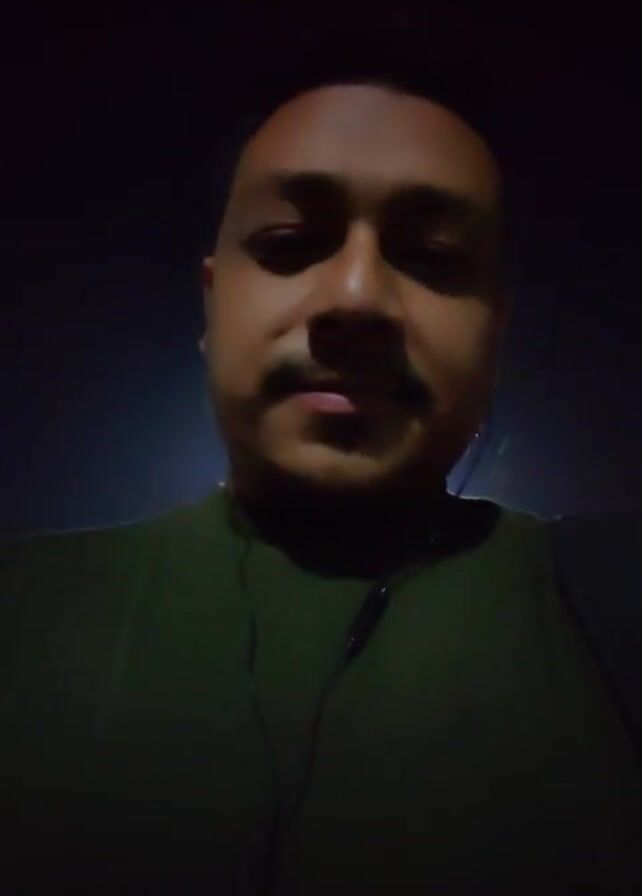A person with brown skin, a mustache, and short black hair is centered in the frame. The person is wearing a dark green t-shirt and wired earphones. The background is very dark, but a faint light source is visible towards the top of the frame. The person looks directly into the camera and smiles slightly. They then look upwards before looking back down.