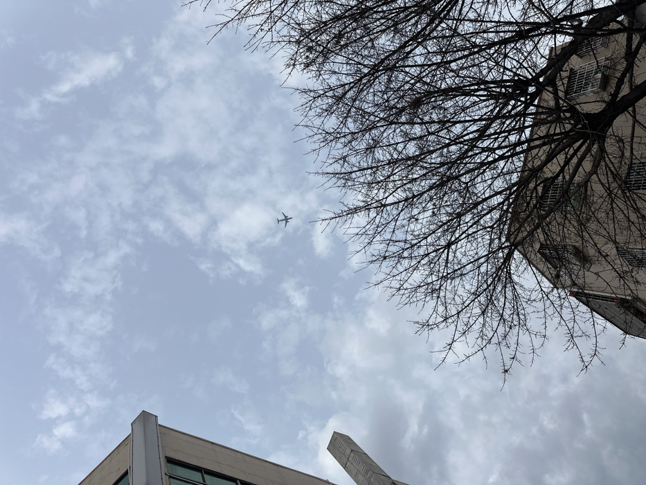 The scene, located in Liwan District, China, presents an upward view of an urban environment under an overcast sky. A silhouetted passenger airplane is visible in distant flight within the upper-middle section of the cloudy sky. To the upper-left, a modern building with a light-colored facade and dark-framed windows partially occupies the frame. Below it, a tall, light-toned, angular structure featuring etched detailing extends upward from the lower-left. The lower-right quadrant is filled by the dense, bare branches of a deciduous tree, partially obscuring a multi-story, beige-colored building behind it. This building exhibits multiple windows fitted with external metal security bars and air conditioning units. No human or animal subjects are observed.