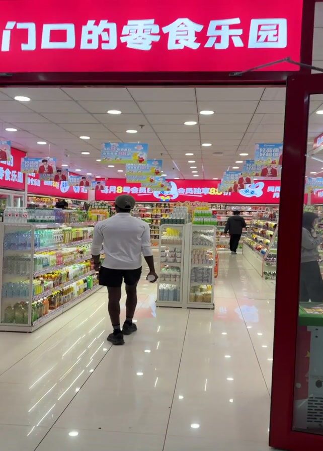 The camera pans from the entrance of a well-lit grocery store. The entrance is marked by a red sign with white text in Chinese, and a green exit sign. A Black man wearing a light-colored long-sleeved shirt, black shorts, a dark baseball cap, and sneakers walks into the store. Inside, rows of shelves are stocked with various food items and beverages. Several other customers are browsing the aisles. The store has a clean, modern appearance with glossy white tiled floors. Promotional banners and posters hang from the ceiling. A checkout counter is visible towards the back of the store with a female customer standing near it. The video ends with the camera focusing on the checkout area.