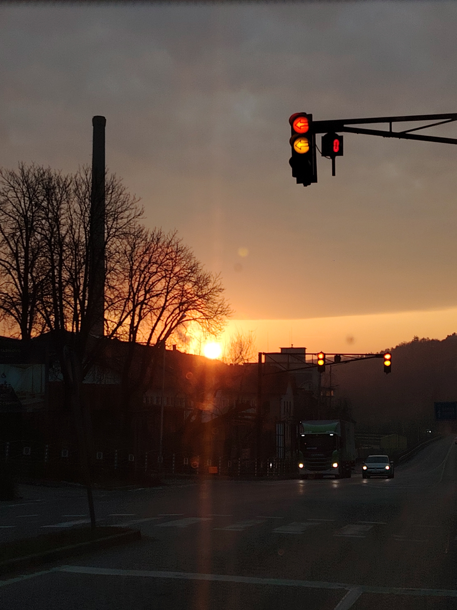 The image depicts an urban roadway at dusk or dawn in the city of Unknown, Unknown. The scene is heavily backlit by a low-lying sun, visible as a bright orange orb just above the horizon on the left side of the frame. The sky transitions from dark grey at the top to a vibrant orange and yellow near the horizon, with notable lens flares emanating from the sun. In the midground on the left, a tall, dark industrial chimney or stack stands prominently, silhouetted against the bright sky. Below and around it are several deciduous trees with bare branches, also silhouetted. Further back, the dark outlines of buildings are discernible. On the right, an overhead gantry spans the roadway, supporting multiple traffic light assemblies. The primary assembly features a red circular light at the top and a yellow left-arrow light below it. Adjacent to it, a smaller red light displays the digit "0." Further down the road on the gantry, another traffic light displays two red circular lights, stacked vertically. Beyond the gantry, a road or bridge ascends, leading to distant hills or mountains silhouetted against the orange sky. The foreground shows a multi-lane asphalt road with visible white markings, including a pedestrian crossing (zebra stripes). Two vehicles are approaching from the distant part of the road, their headlights illuminated. In the left lane, a green semi-truck with white headlights is visible. To its right, in the adjacent lane, a lighter-colored passenger car also approaches with its headlights on. No people are visible in the scene.