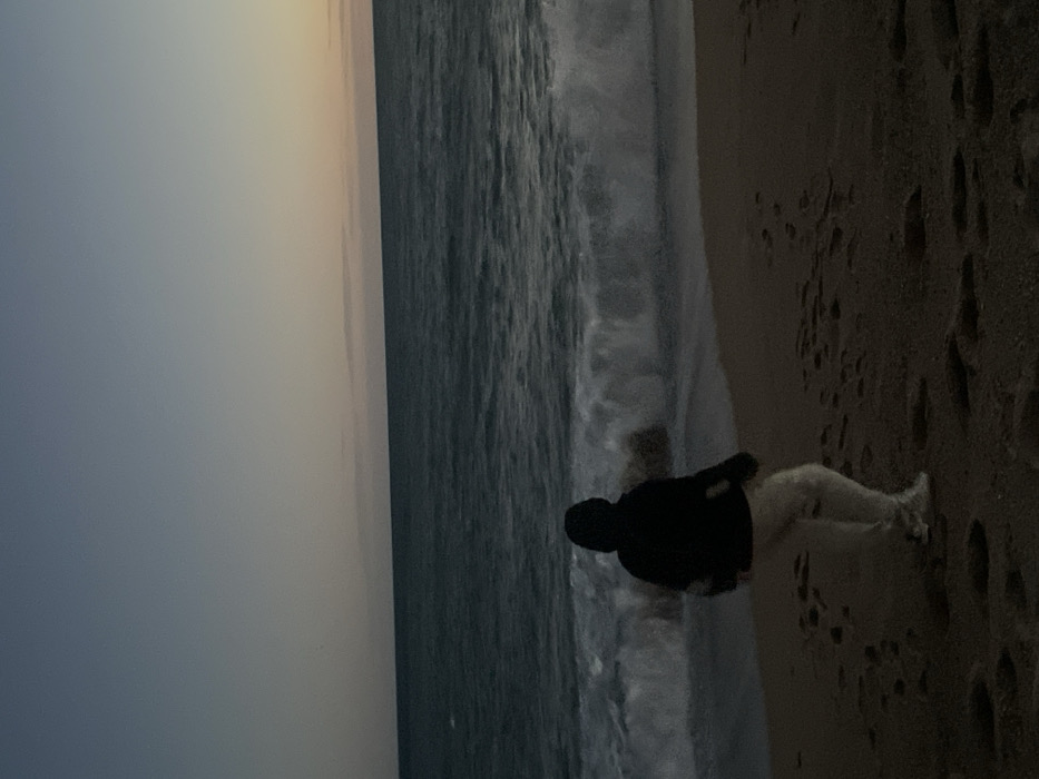 A lone figure stands on a sandy beach, facing the ocean. The person is clad in a dark jacket and light-colored pants. Waves gently crash onto the shore beside them. The sky, a gradient of muted colors, meets the sea in the distance. The sand is marked with scattered footprints. The image's composition is simple, capturing a quiet moment by the sea.